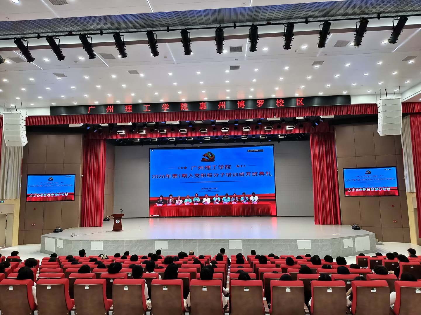 3月19日,学校党校2026年第一期入党积极分子培训班开班典礼在白云校区3号报告大厅举行,惠州校区学员通过线上直播同步参加。党委书记黄圣诚,党委副书记、副校长张志红出席典礼,副校长肖海在惠州校区参加本次典礼,学校相关职能部门、二级党组织书记以及465名师生入党积极分子参加本次开班仪式。典礼由党委委员、党委组织部部长陈朝阳主持。